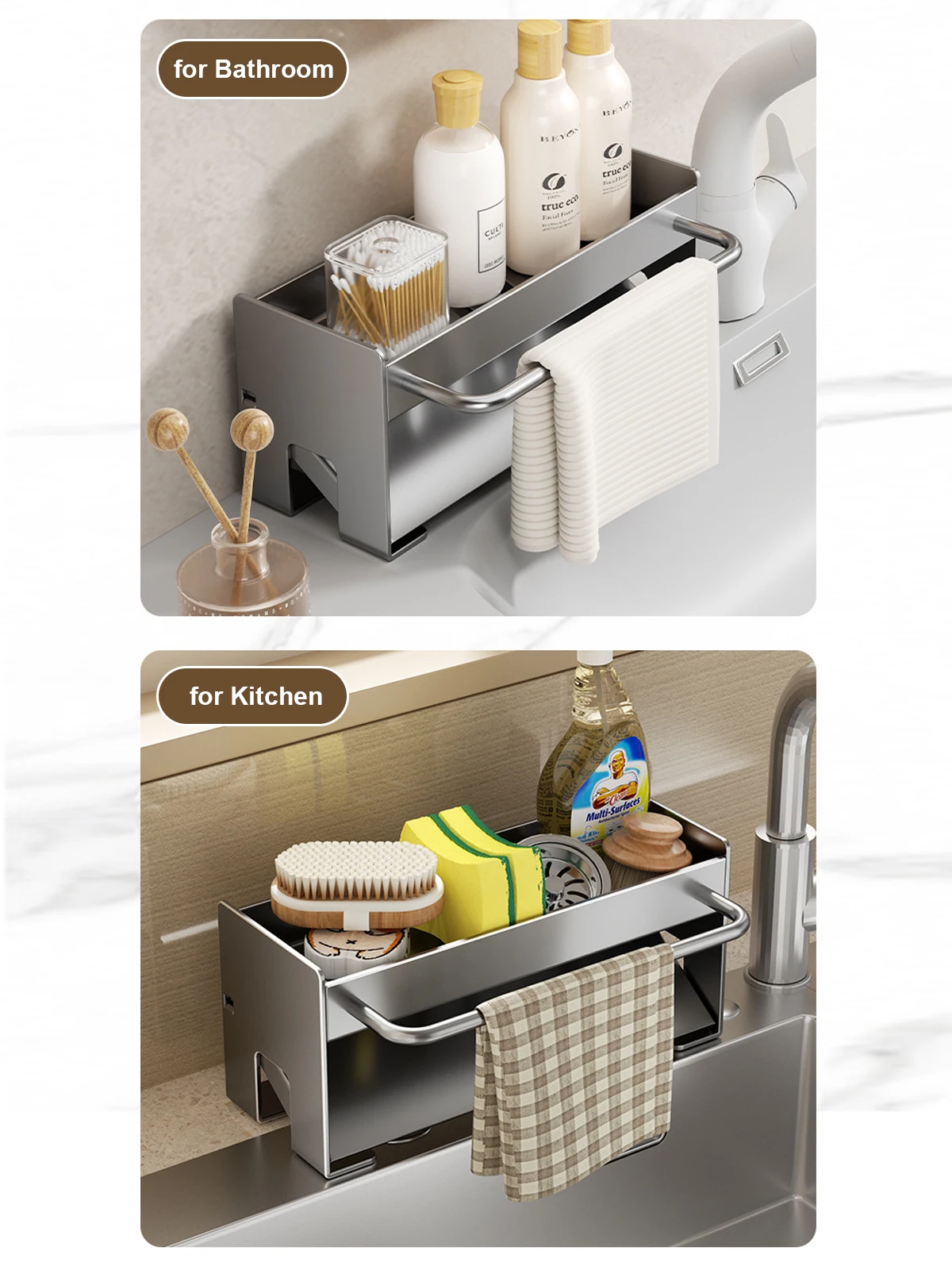 The Space Aluminum Kitchen Sponge Holder not only maximizes your storage capabilities but also promotes hygiene by allowing water to drain away from sponges and soap, preventing mold and unpleasant odors. Its elegant design complements various decor styles, making it an ideal choice for kitchens and bathrooms alike. Whether you are looking to streamline your cleaning routine or simply want to enhance your storage solutions, this organizer is the perfect choice.